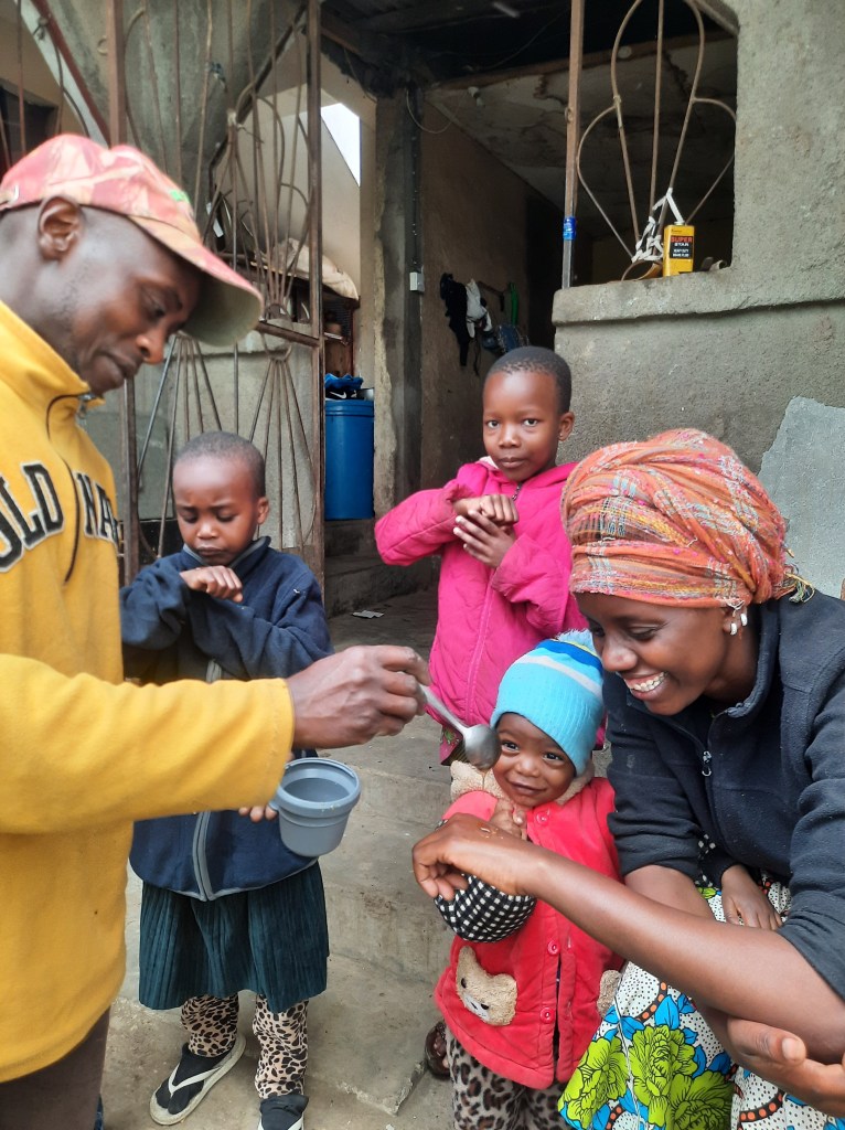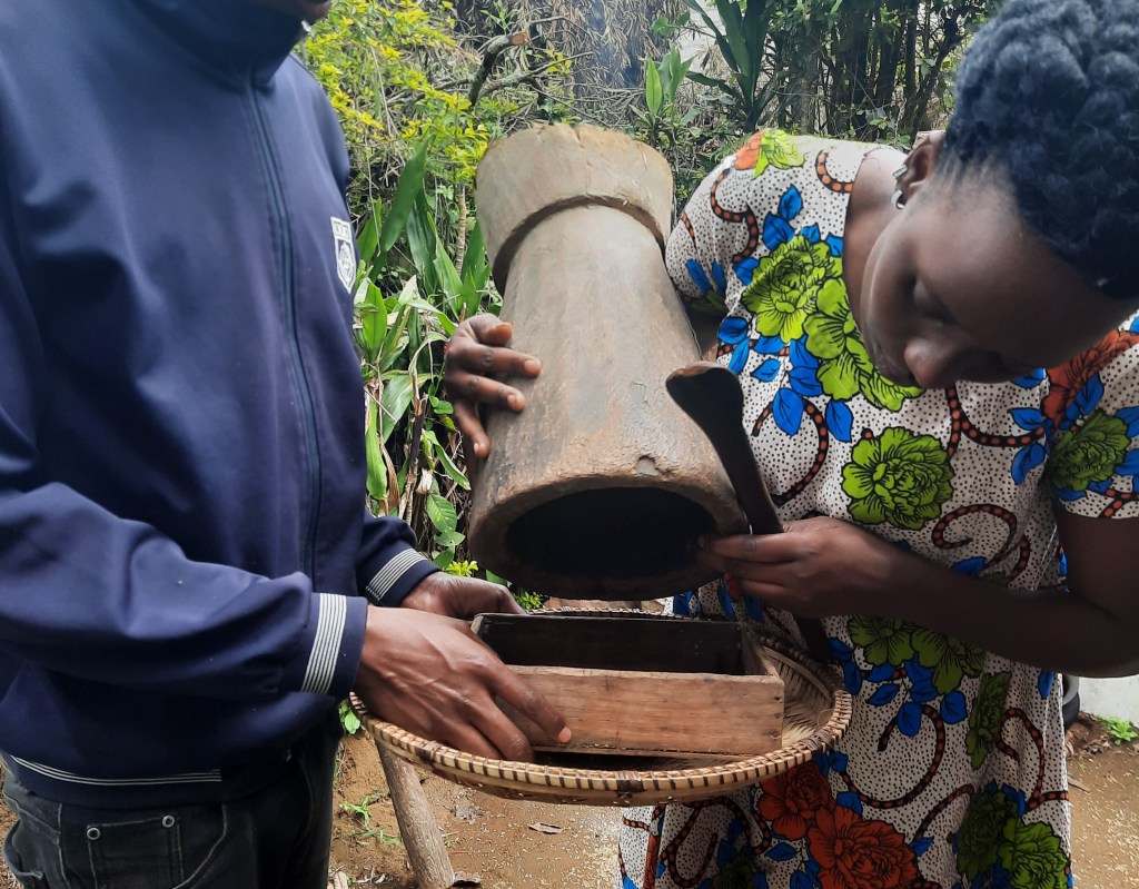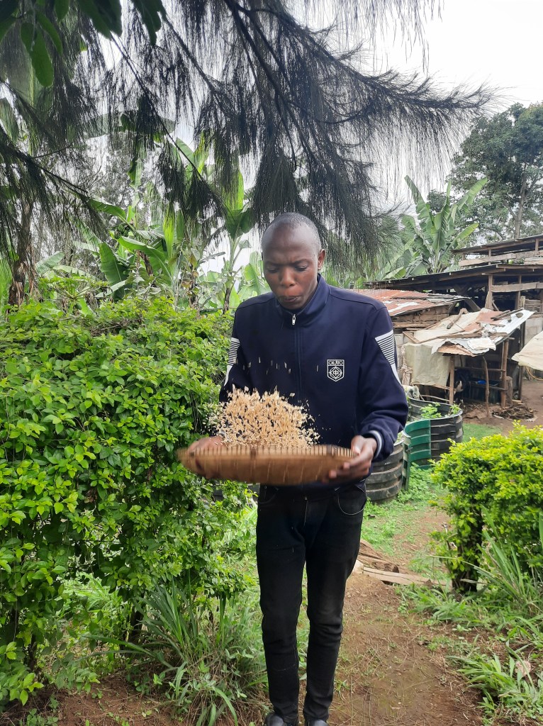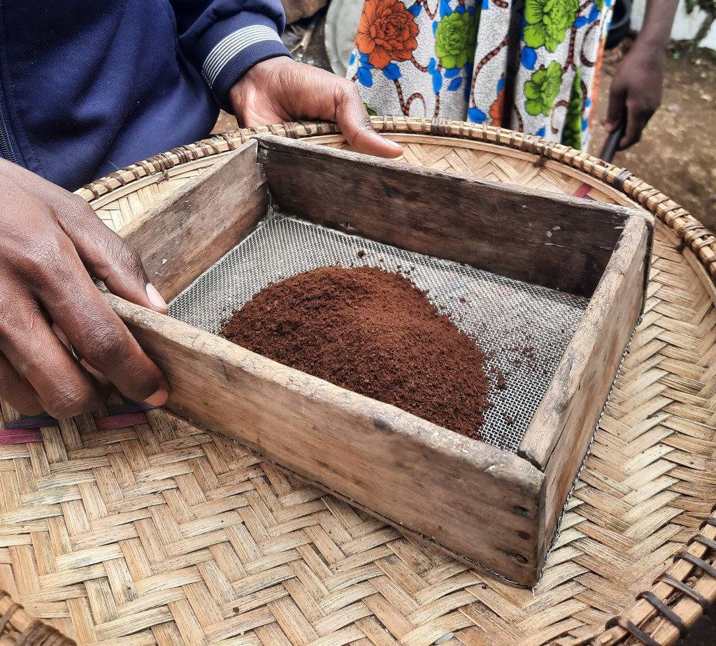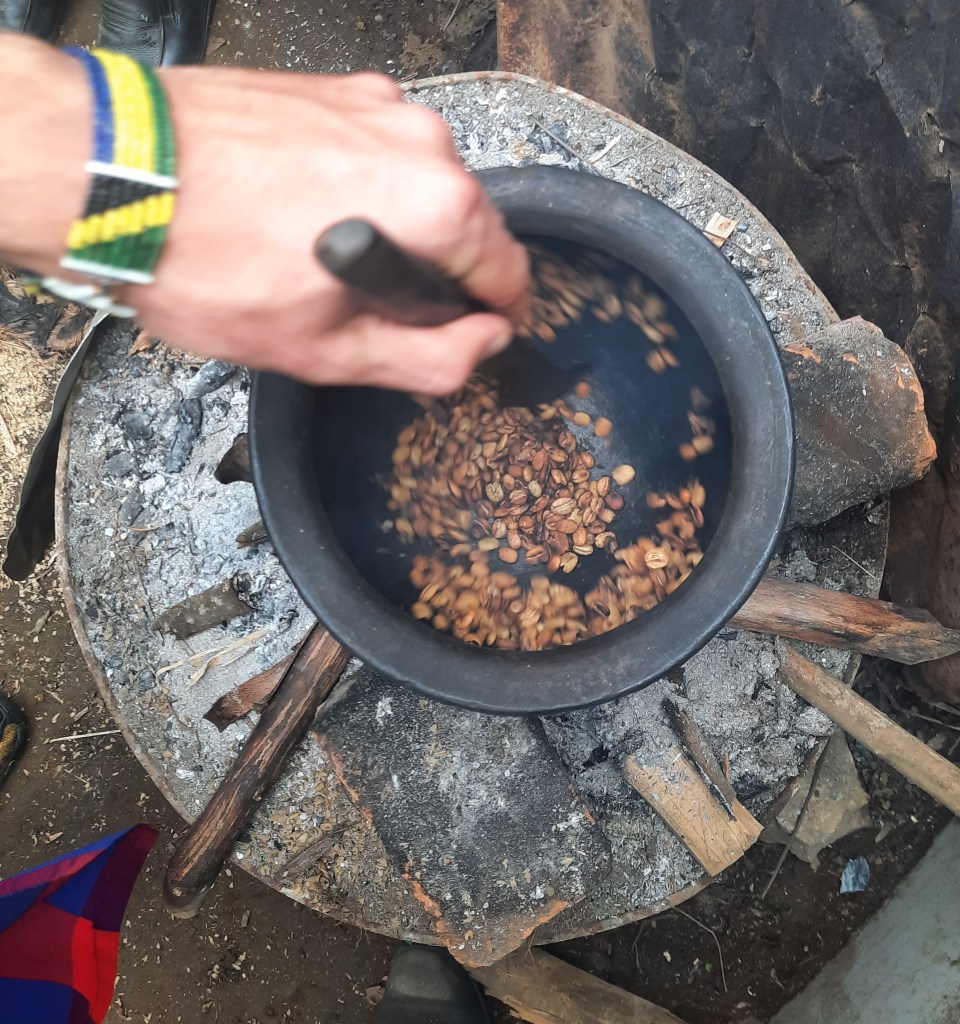 Back in the Pallangyo home, we made coffee from scratch. In Tanzania, two types of coffee are grown, Robusta and Arabica. Row beans are covered by a hard skin between green and red. Inside they are white and covered by a sweet layer. After sunroasting them for three days, the fun process starts. The process to grind coffee beans with the mortar is tiring so the family gathers together to do it and sing and dance cheering the person with the large wooden mortar. We all took turns to break the beans to then separate skilfully separate the shells. In the picture below is Justin flippin the beans on this plate in a way that the skin falls out but the beans remain on the plate. The beans were then roasted until they turned black and finally resemble the coffee beans we have all see in Europe. We then all took turns to grind them with the heavy wooden mortar, filtered the powder and boiled it with water. To serve it, the coffee is filtered again with a little colander.