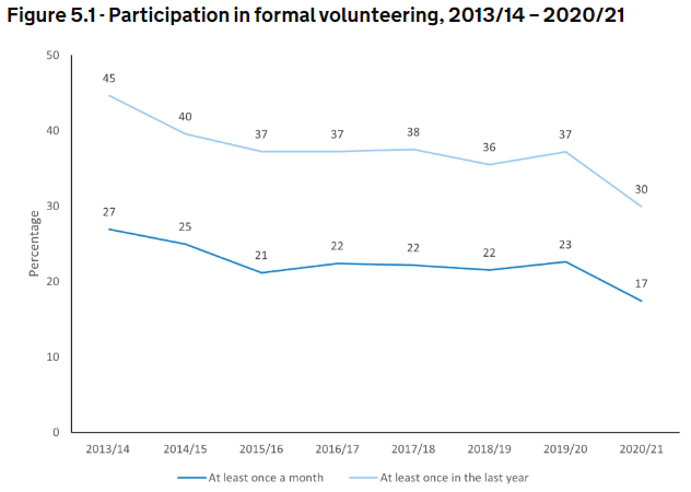 Department for Digital, Culture, Media & Sport. GOV.UK. ‘Official Statistics. Volunteering and Charitable Giving – Community Life Survey 2020/21’ (online): https://www.gov.uk/government/statistics/community-life-survey-202021-volunteering-and-charitable-giving/volunteering-and-charitable-giving-community-life-survey-202021#motivators-and-barriers-to-volunteering